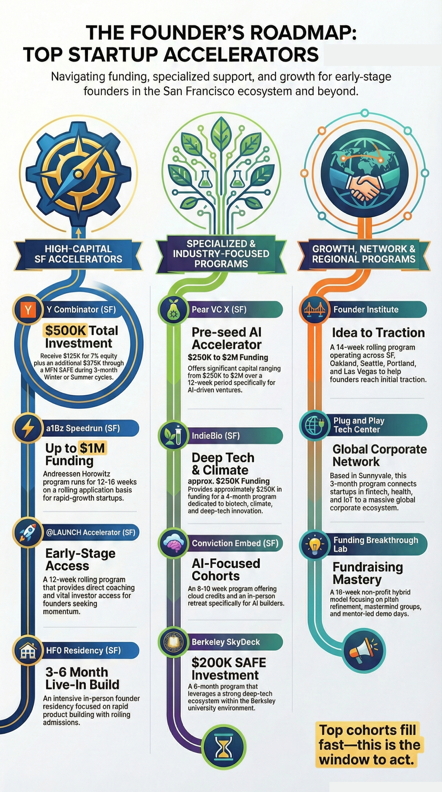 Pre-seed startup funding timelines are unpredictable in ways that make it impossible to plan around a single program's cycle. A company that is turned down by YC in the winter batch may be a perfect fit for SkyDeck's next cohort. Programs that run on rolling admissions like Plug and Play and Founder Institute mean that the rejection from one program does not create a months-long wait before the next attempt. Building a prioritized list that includes both fixed cohort programs and rolling admissions programs is the most resilient approach for a founder who is serious about finding the right accelerator fit.