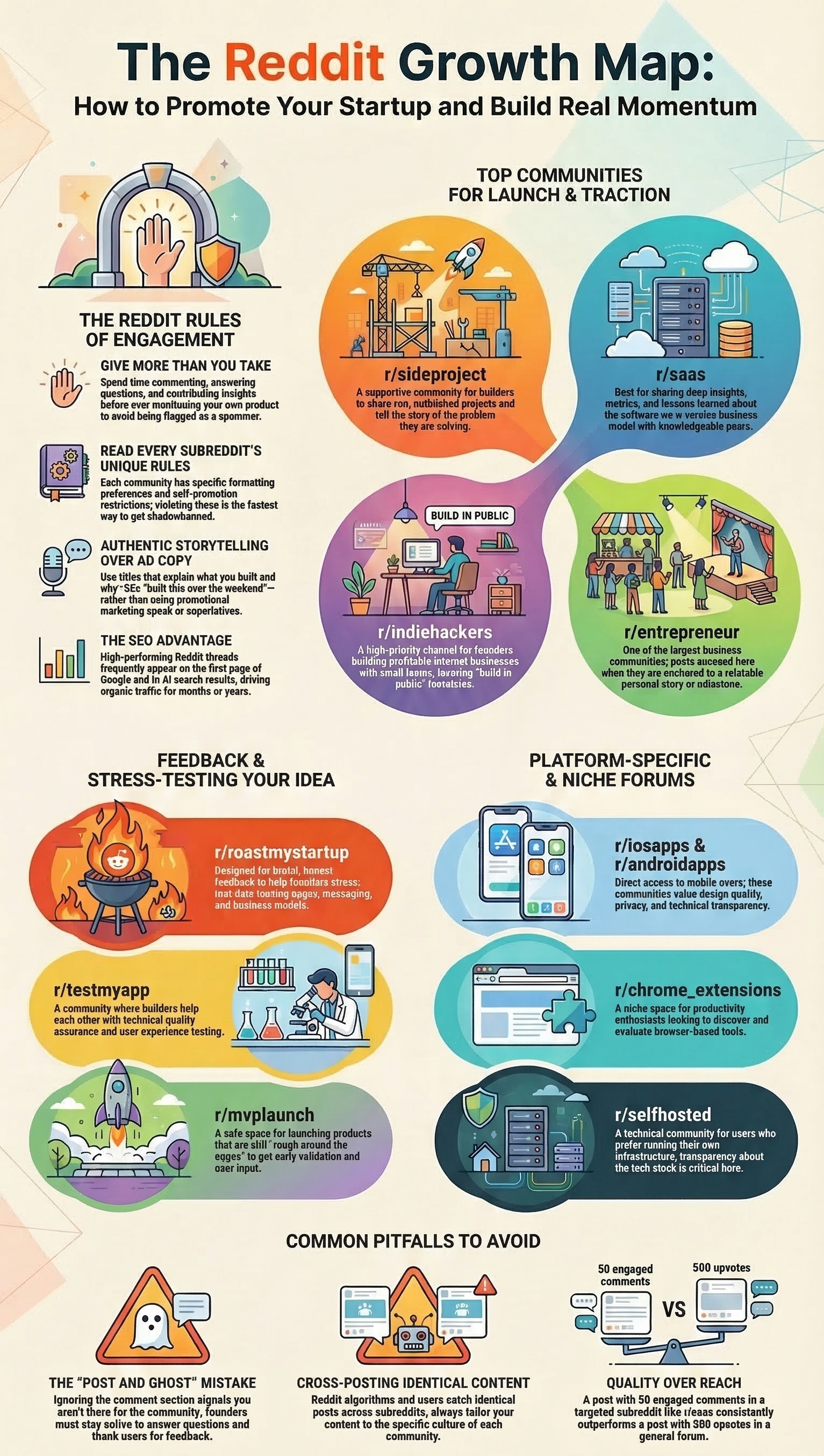 The most effective Reddit promotion strategy for startups is not about going viral on a single post. It is about becoming a recognized, trusted voice in two or three communities over a period of weeks. Start by identifying the three communities most relevant to your startup from this list and spend the first week doing nothing but reading, upvoting, and commenting on other people's posts. Learn the vocabulary, the recurring questions, the celebrated members, and the topics that generate the most engagement.