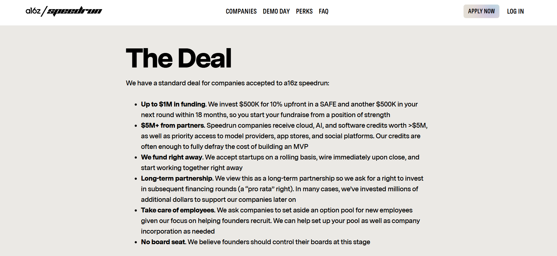 - 💰 Up to $1M investment, plus access to a16z’s powerful operator network and $5M+ in partner credits.