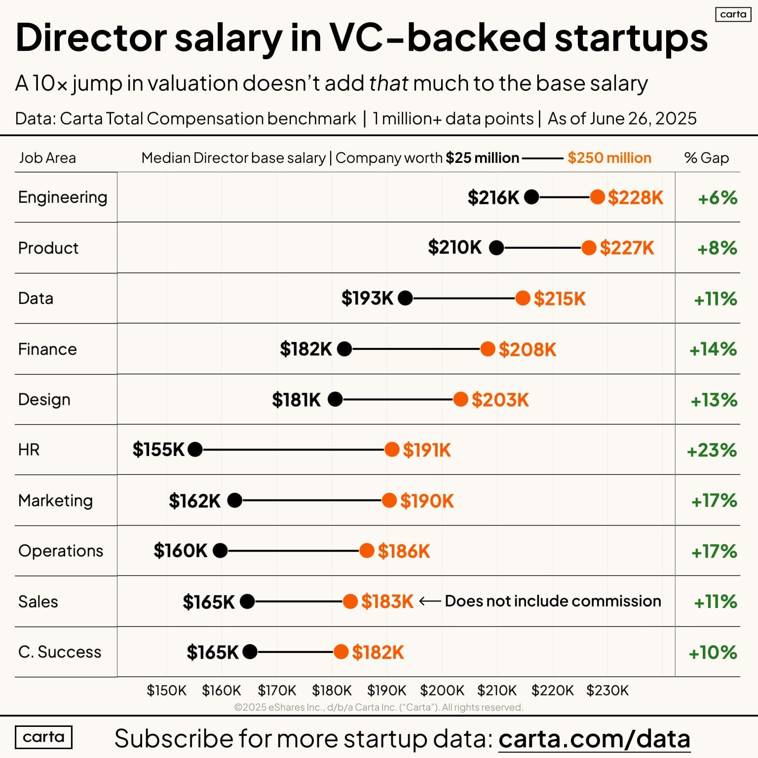 At a $25M company (Seed/Series A), a Director in Data earns around $193K. At a $250M company (Series C), it’s about $215K — just an 11% jump.