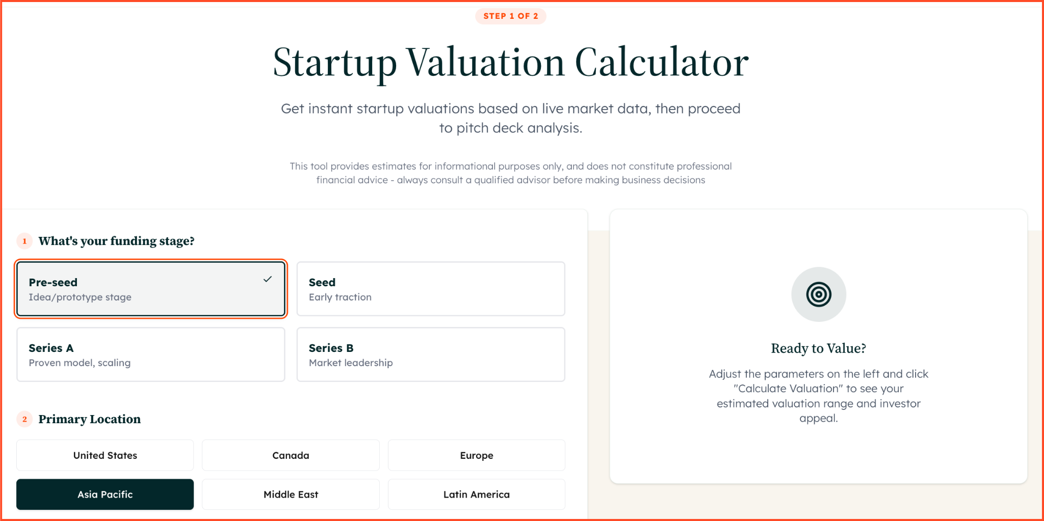 - Choose your primary location — valuation benchmarks vary by region