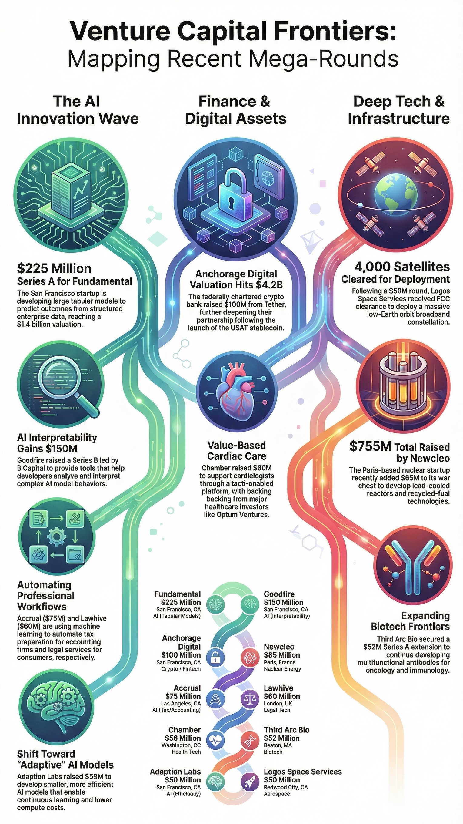 Fresh capital continues pouring into AI, fintech, healthtech, legal, space, energy, and biotech, signaling strong conviction in AI-native and regulated, defensible businesses.