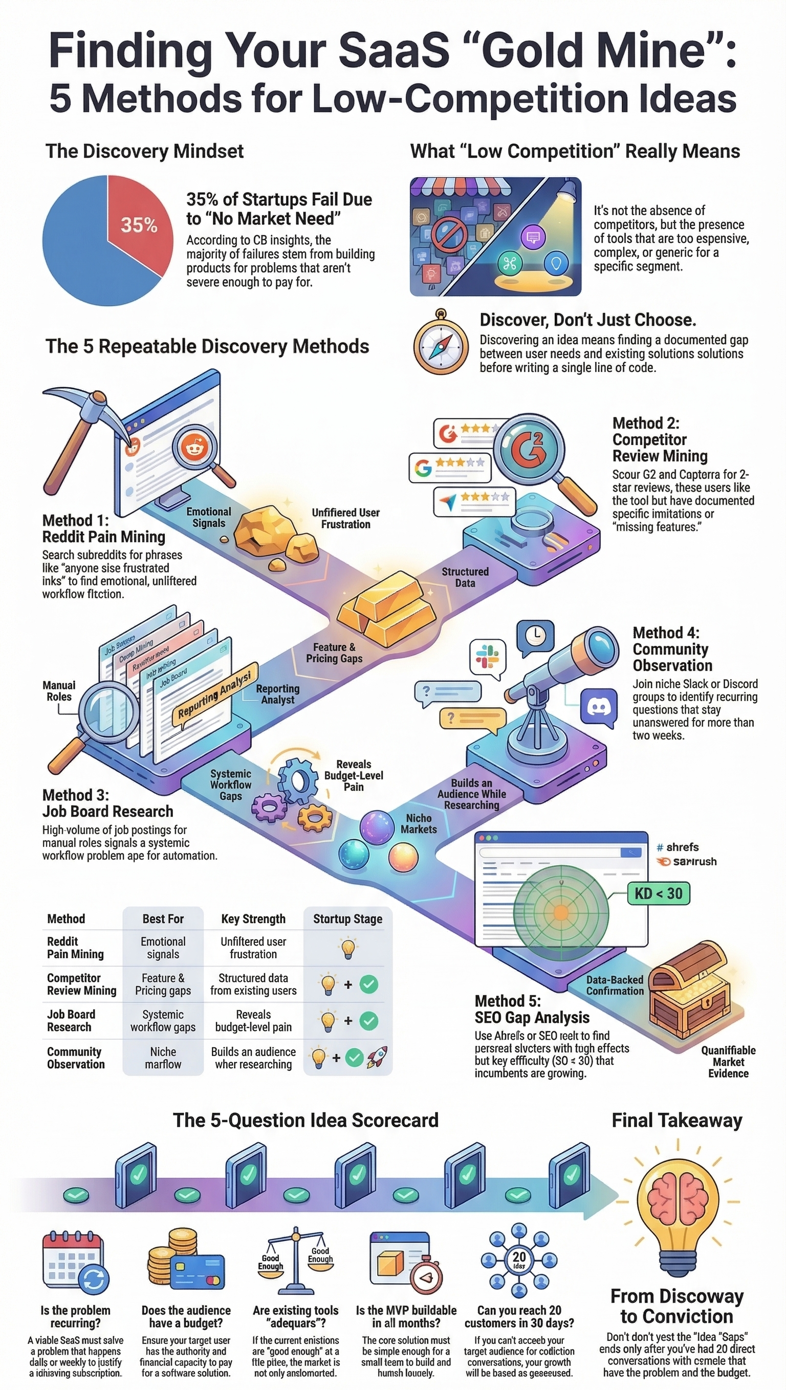 The most reliable approach combines multiple discovery methods: Reddit pain mining to surface emotional signals, competitor review mining on platforms like G2 and Capterra to identify feature gaps, and job board research to find systemic workflow problems. Low competition is identified when existing tools serve a problem but are too expensive, too broad, or too complex for a specific audience segment. Confirming low competition with keyword difficulty data from Ahrefs or SEMrush adds quantitative validation before committing to an idea.