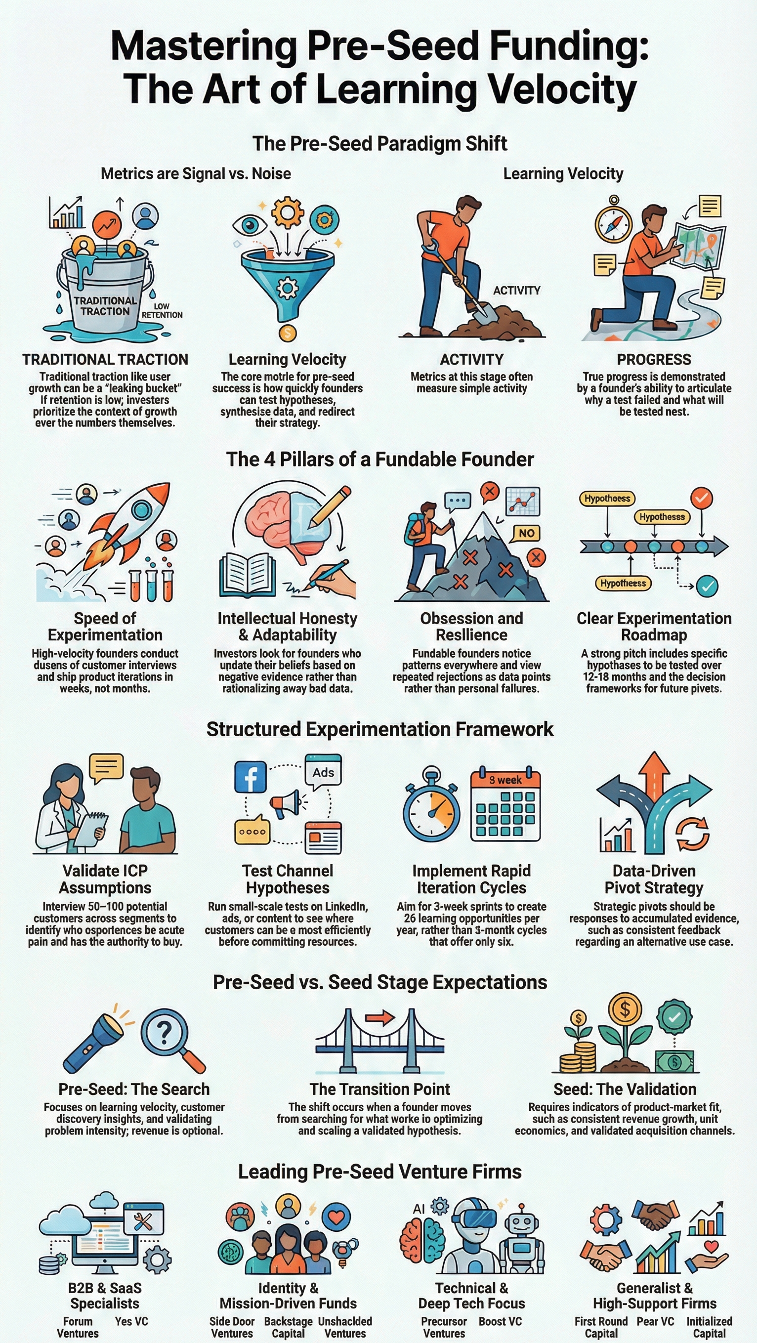 Transition Point: The shift from pre-seed to seed happens when founders move from searching for product-market fit to optimizing and scaling what works. Pre-seed funds learning; seed funds execution against a validated hypothesis.