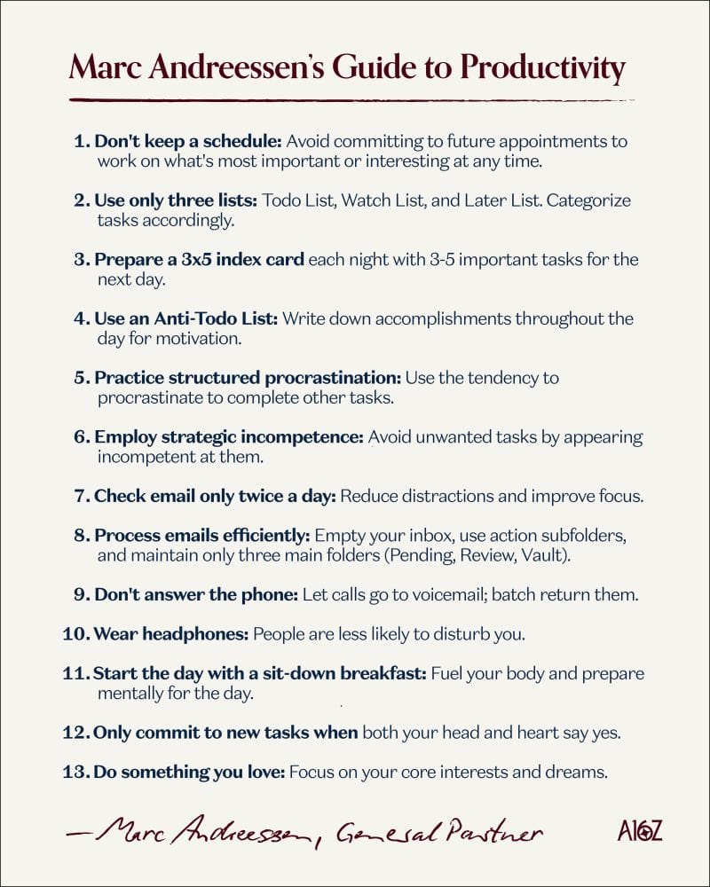 Marc Andreessen, co-founder of Netscape and Andreessen Horowitz, developed a productivity framework that prioritizes flexibility over rigid structure and focuses on outcomes rather than scheduled activities.