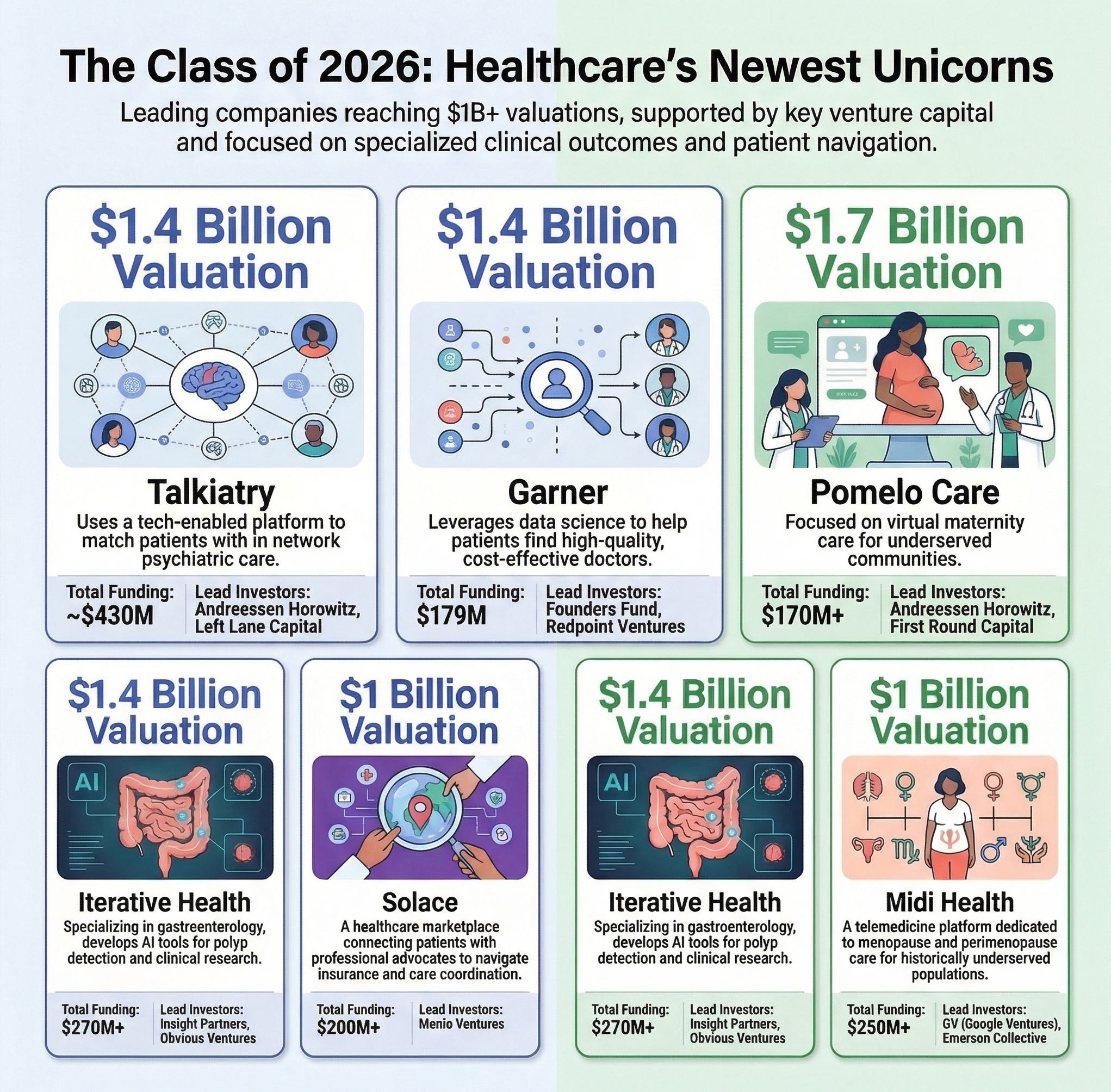 Healthcare companies continue to generate unicorn outcomes at a rate that rivals pure technology. The 2026 class includes companies in psychiatric care, maternity health, digestive disease, women's health, and patient navigation. What unites these companies is a common challenge: the existing healthcare system leaves large populations underserved, and technology-enabled models can reach these populations more cost-effectively than traditional care delivery.