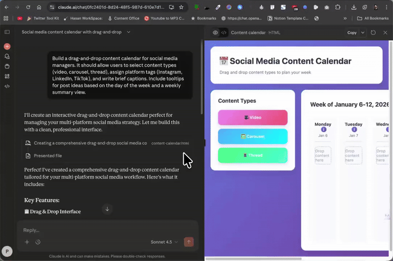 Create a drag-and-drop calendar for social teams to:- Choose content types (video, carousel, thread)
