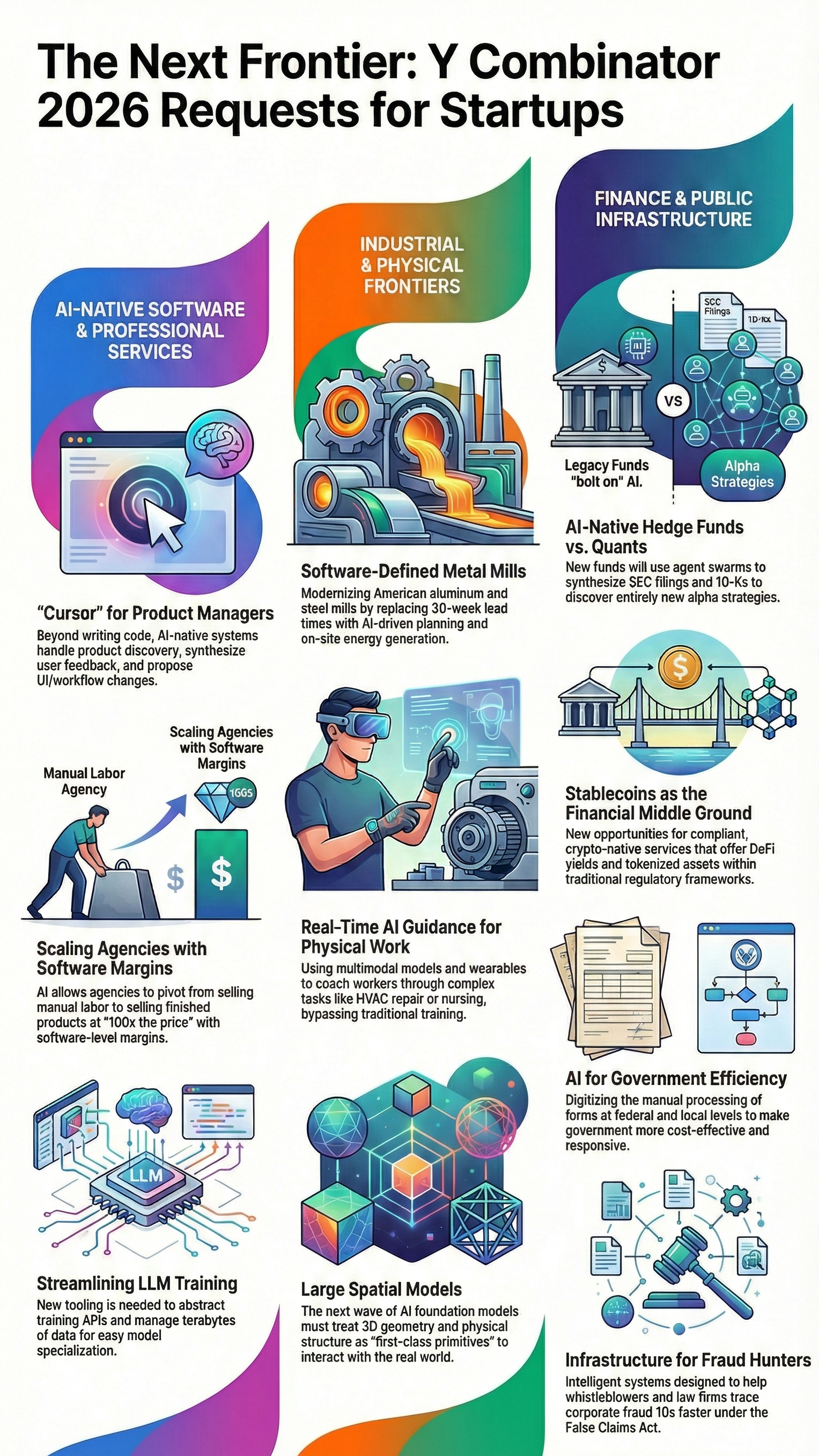 Y Combinator's Spring 2026 Requests for Startups outlines specific problem areas where experienced investors and operators see structural opportunities. The collection spans AI applications, financial infrastructure, industrial systems, and foundational research. Each category represents distinct risk-reward profiles and requires different founder capabilities.